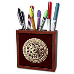 Gold sands ornate vintage architectural element on dark chocolate background Tile Pen Holder is measuring 5w x 5h x 2d. Made from high quality solid mahogany wood with satin finish and one 4.25 commercial grade mirror gloss ceramic tile. Looks great on a desk or counter top with a full color custom imaged tile.